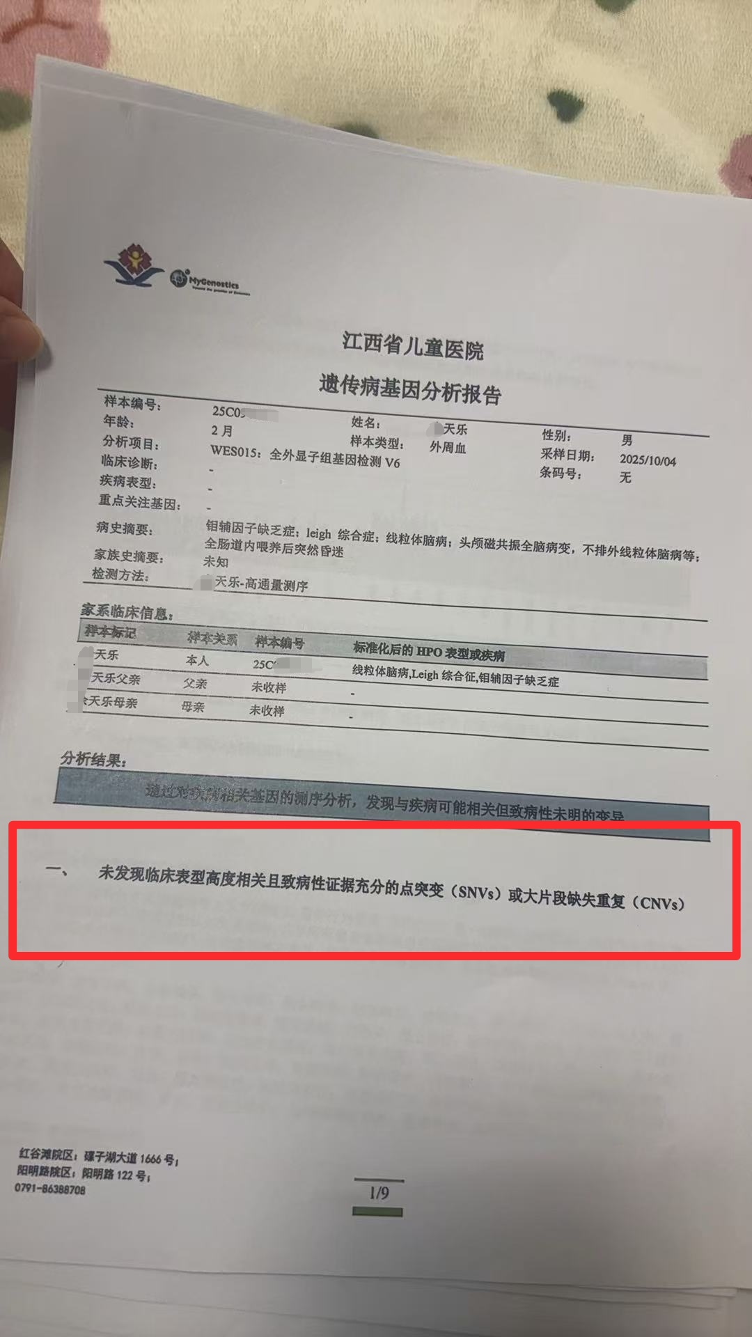 “10月初,我们按照医生的建议,分别在省妇幼本院和江西省儿童医院进行了新生儿头颅MRI、遗传病基因检测,结果显示均无异常。”黄女士认为,既然排除了孩子的自身原因,那么,病危很可能是受到外界因素的影响。